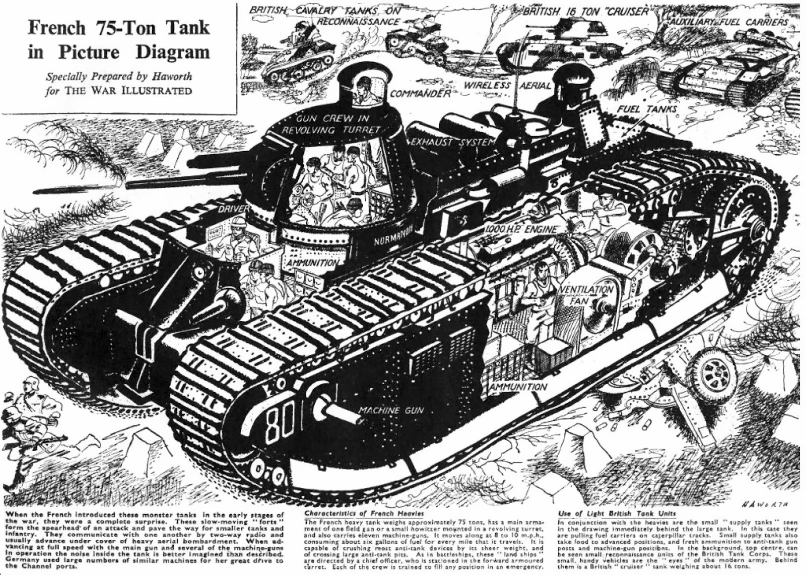Экипаж танка состоял из двенадцати человек: водитель, командир, стрелок пушки, заряжающий, четыре пулеметчика, механик, электрик, помощник механика и радист. Расположение их было следующим: