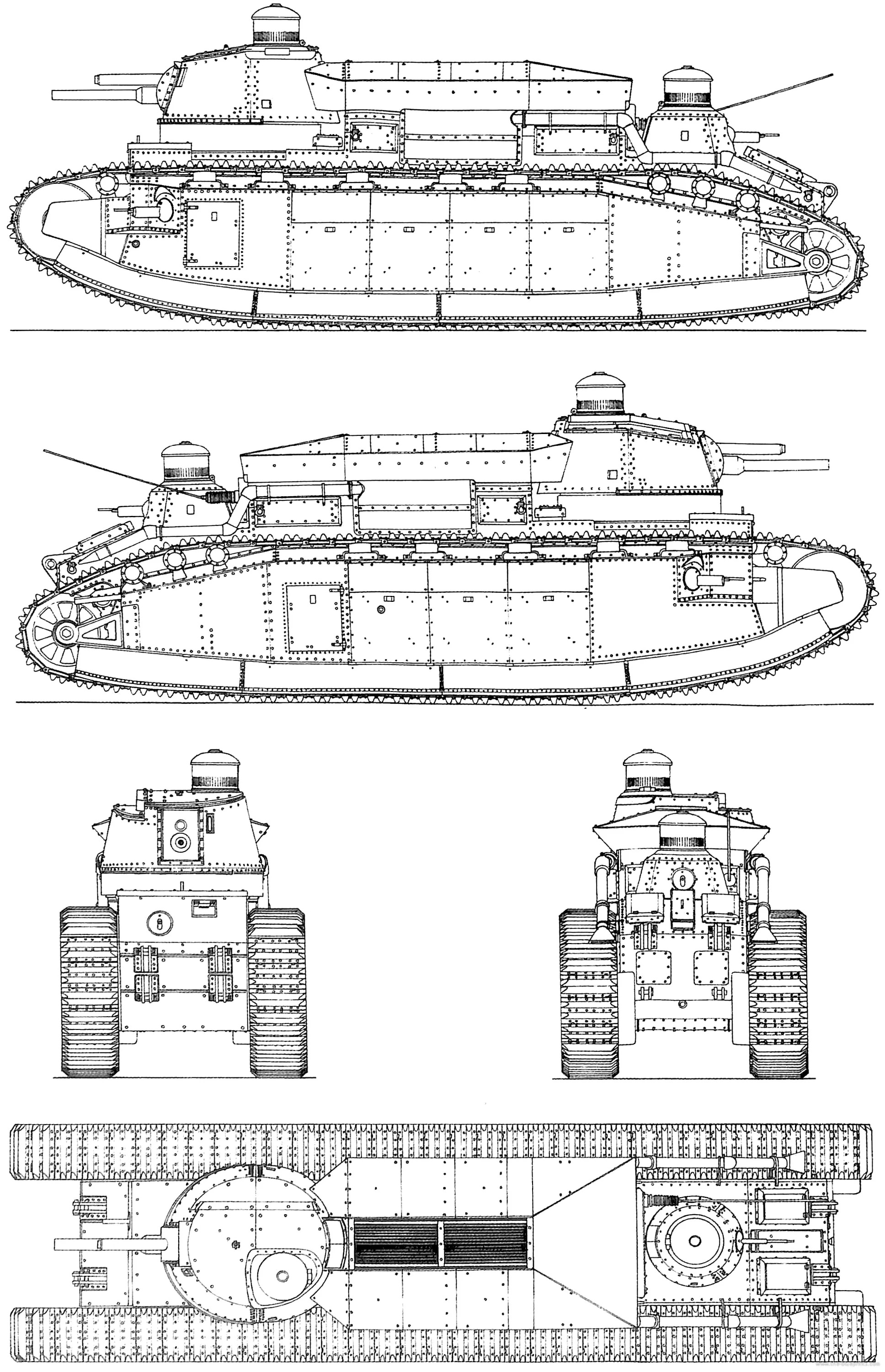 Танк был разделен на четыре секции, от носа к корме: отделение управления (с курсовым пулеметом), переднее боевое отделение (с пушечной башней и двумя бортовыми пулеметами), моторно-трансмиссионный отсек, и заднее боевое отделение (с пулеметной башенкой).